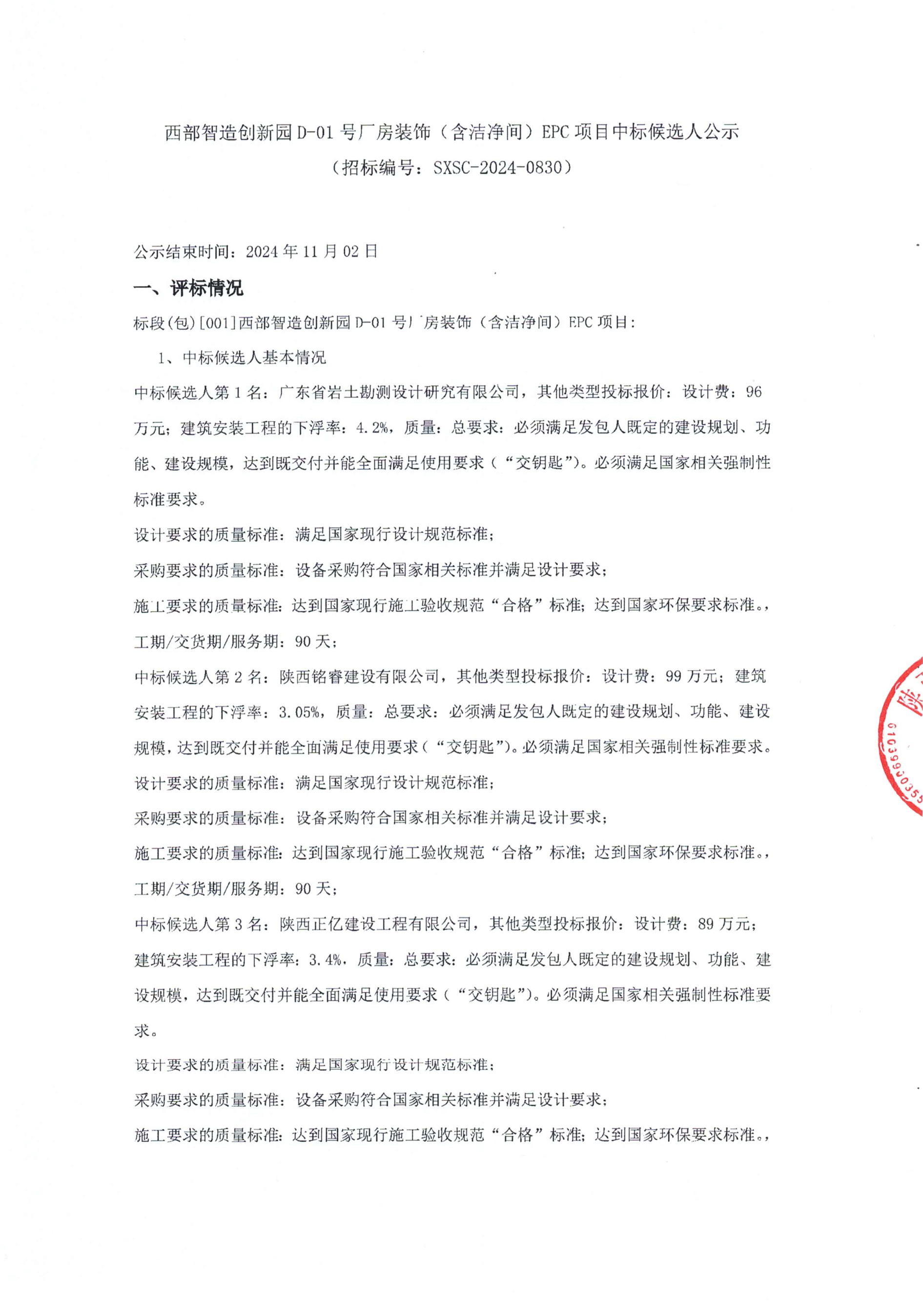 西部智造创新园D-01号厂房装饰(含洁净间)项目EPC招标中标候选人公示
