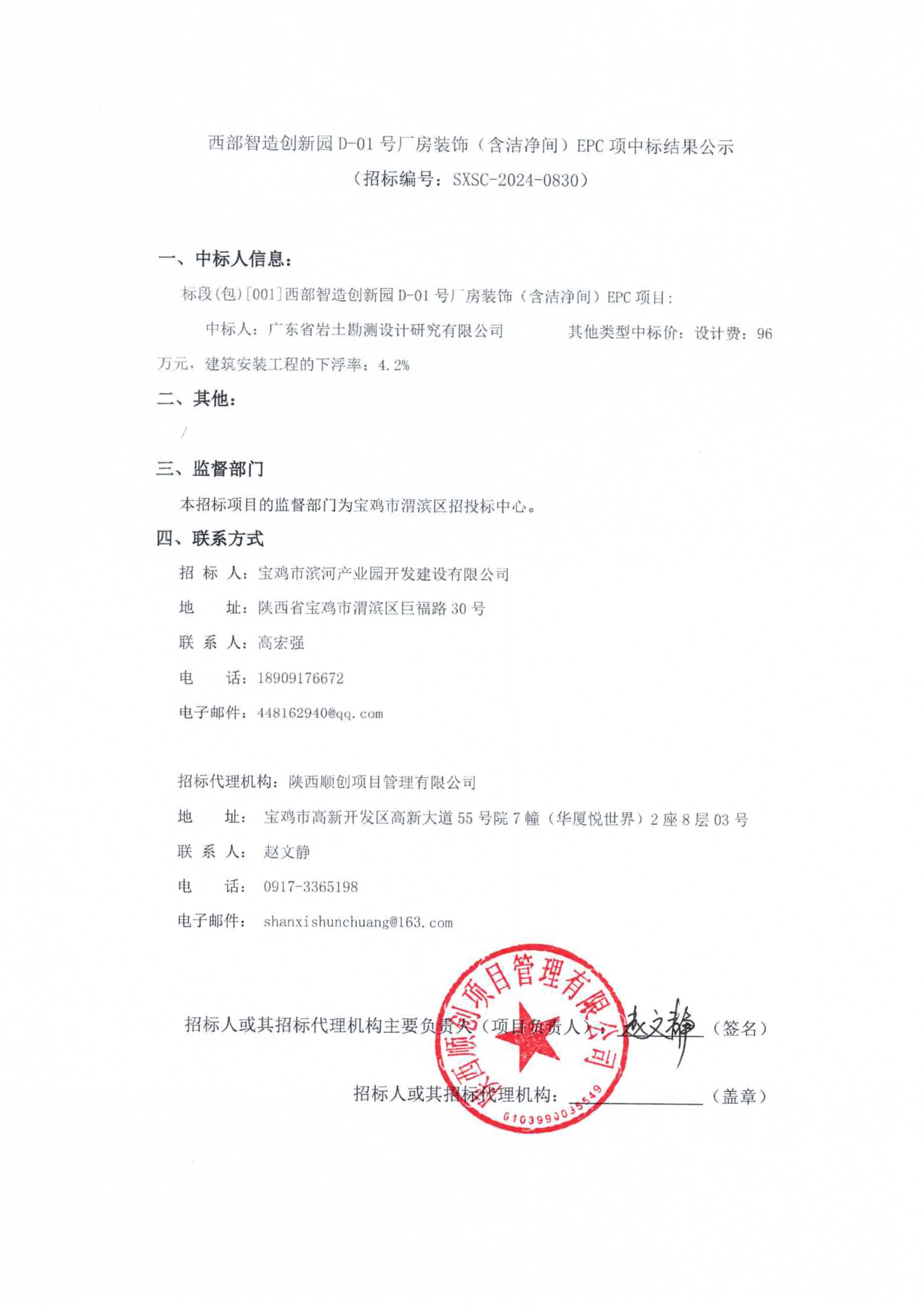 西部智造创新园D-01号厂房装饰(含洁净间)项目EPC招标中标结果公示
