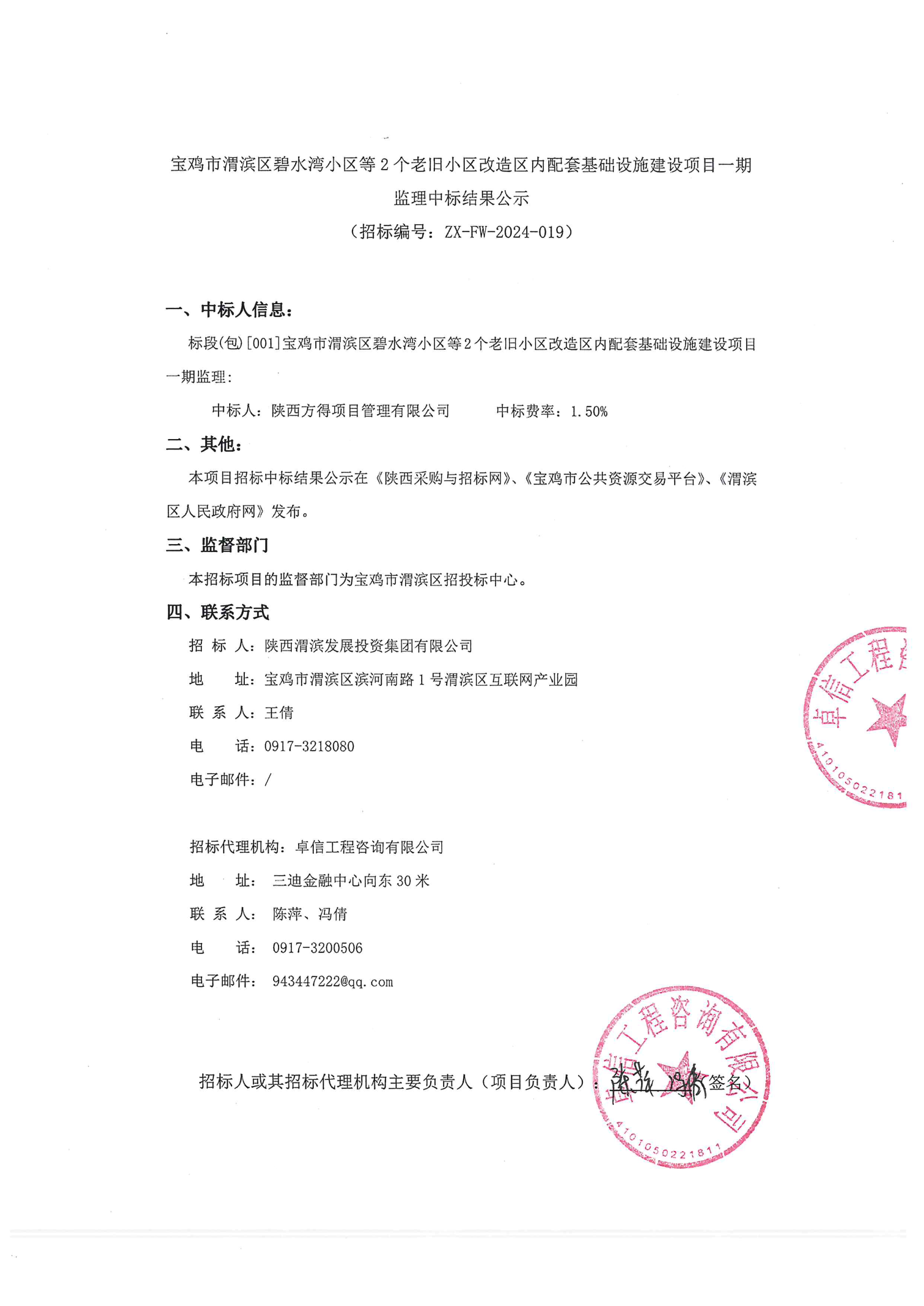 宝鸡市渭滨区碧水湾小区等2个老旧小区改造区内配套基础设施建设项目一期监理招标中标结果公示