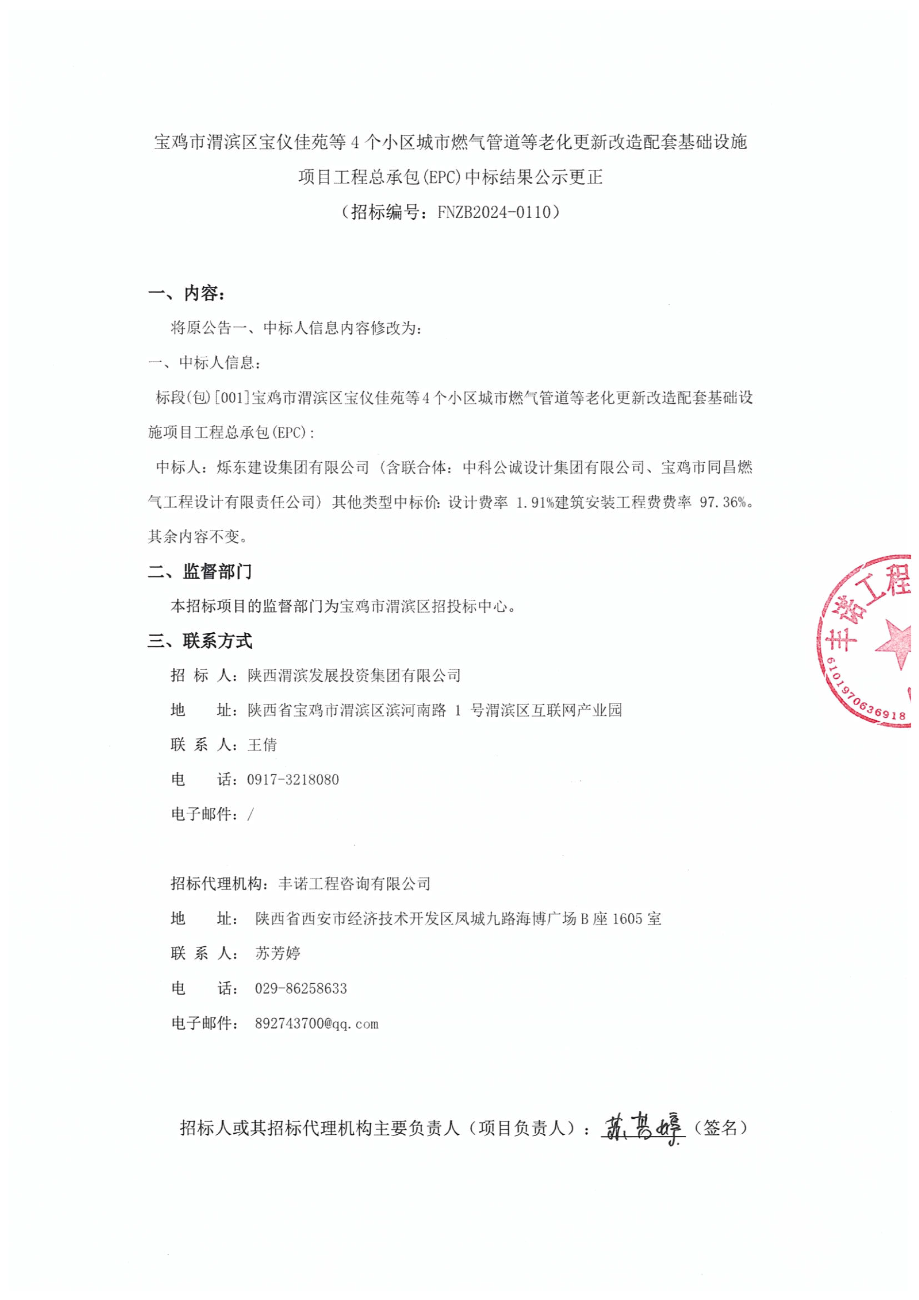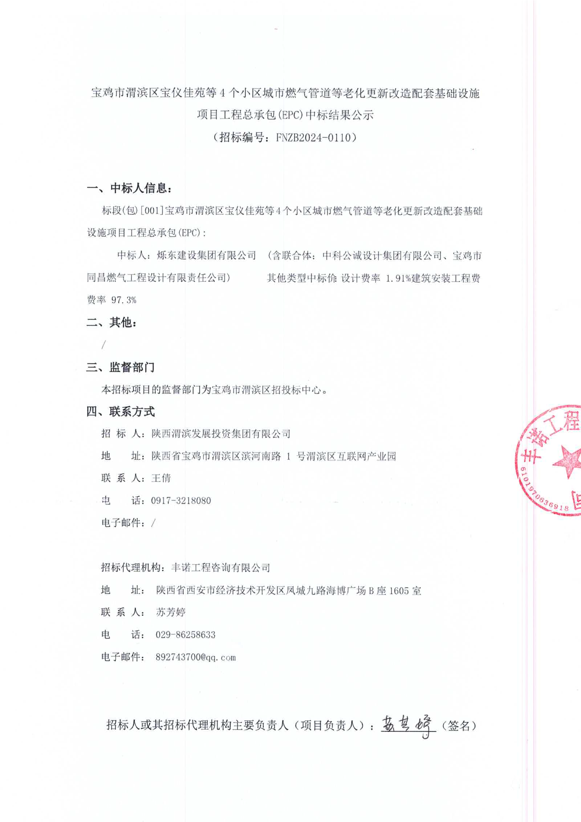 宝鸡市渭滨区宝仪佳苑等4个小区城市燃气管道等老化更新改造配套基础设施项目工程总承包(EPC)中标结果公示