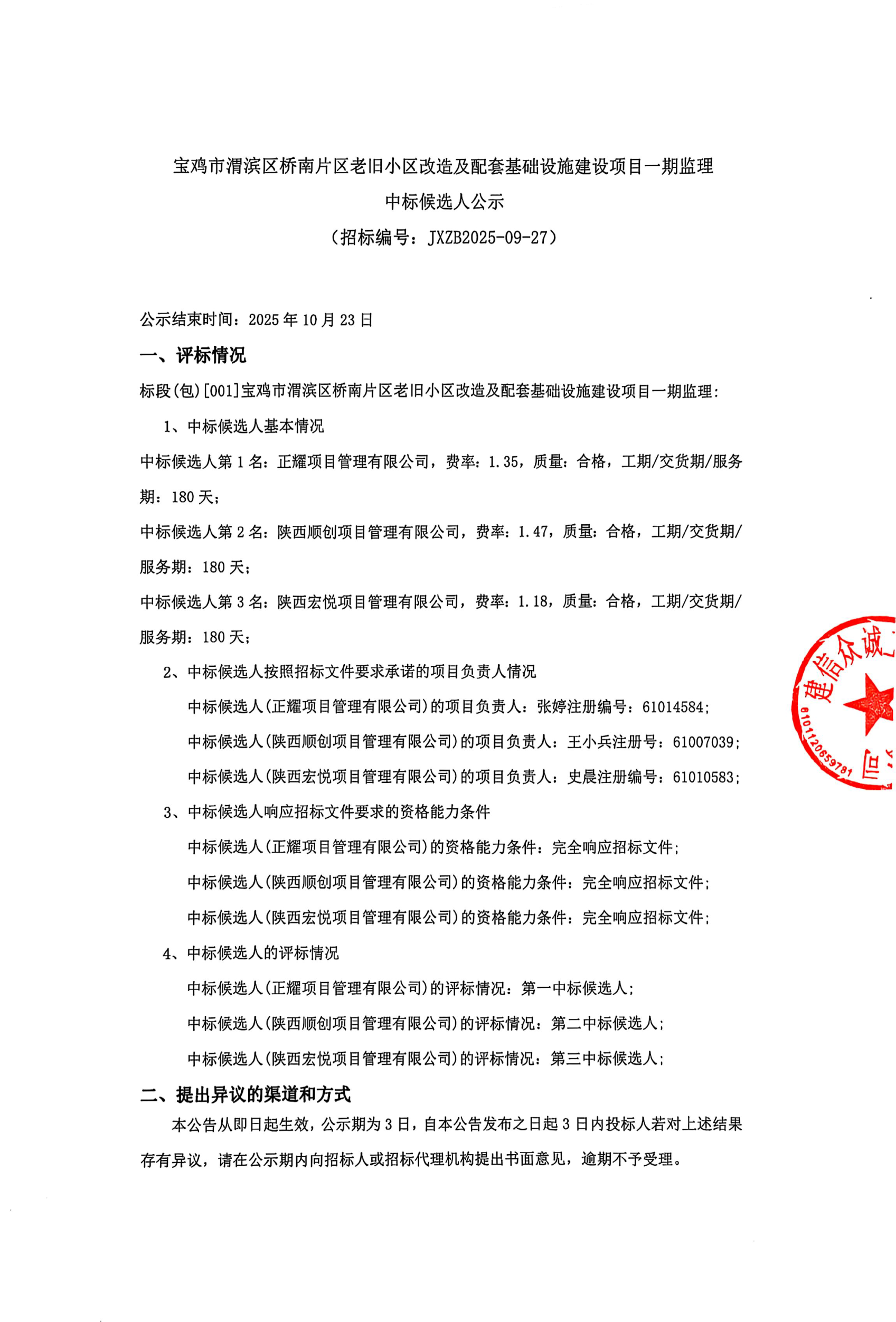 宝鸡市渭滨区桥南片区老旧小区改造及配套基础设施建设项目一期监理中标候选人公示