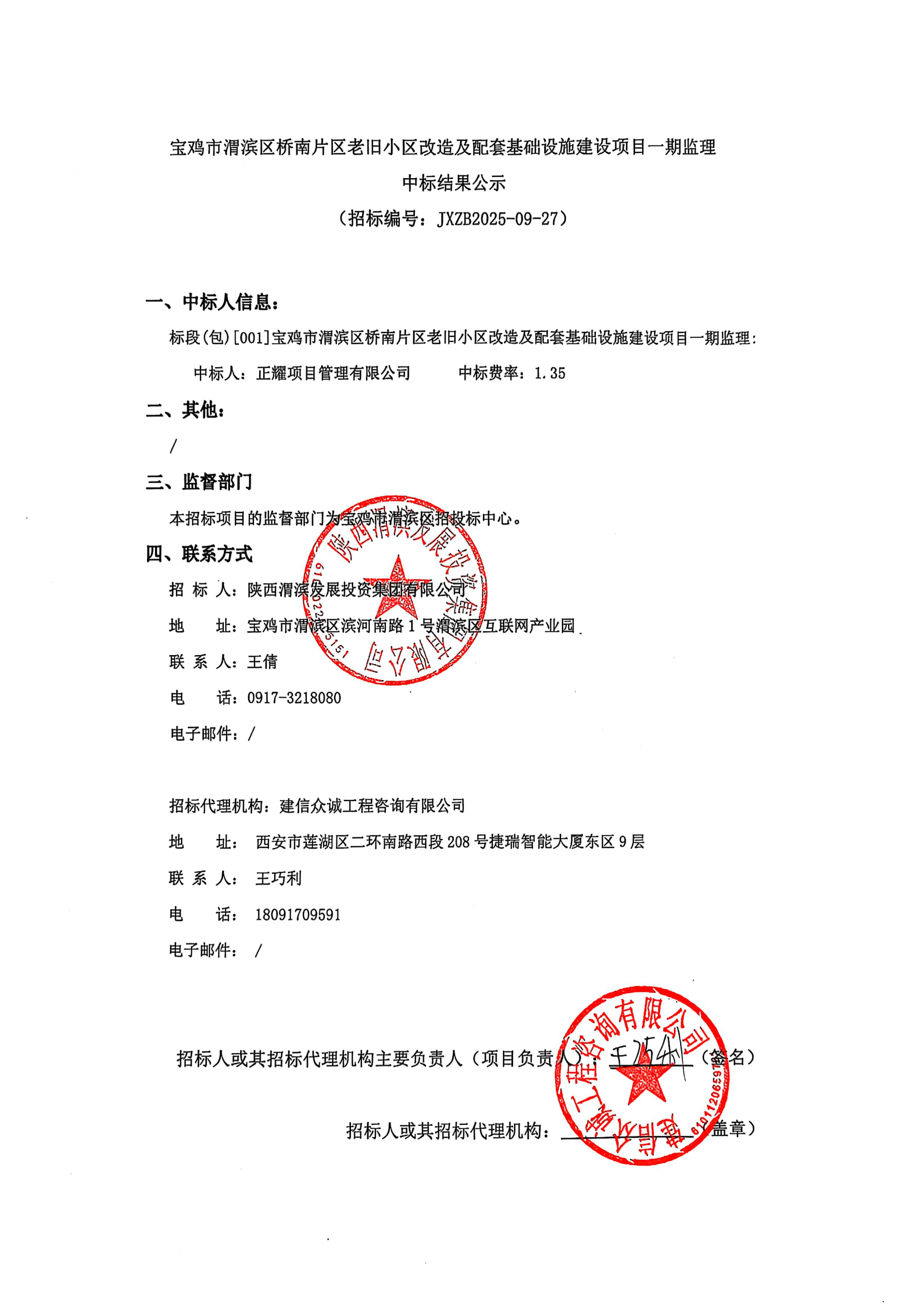 宝鸡市渭滨区桥南片区老旧小区改造及配套基础设施建设项目一期监理中标结果公示