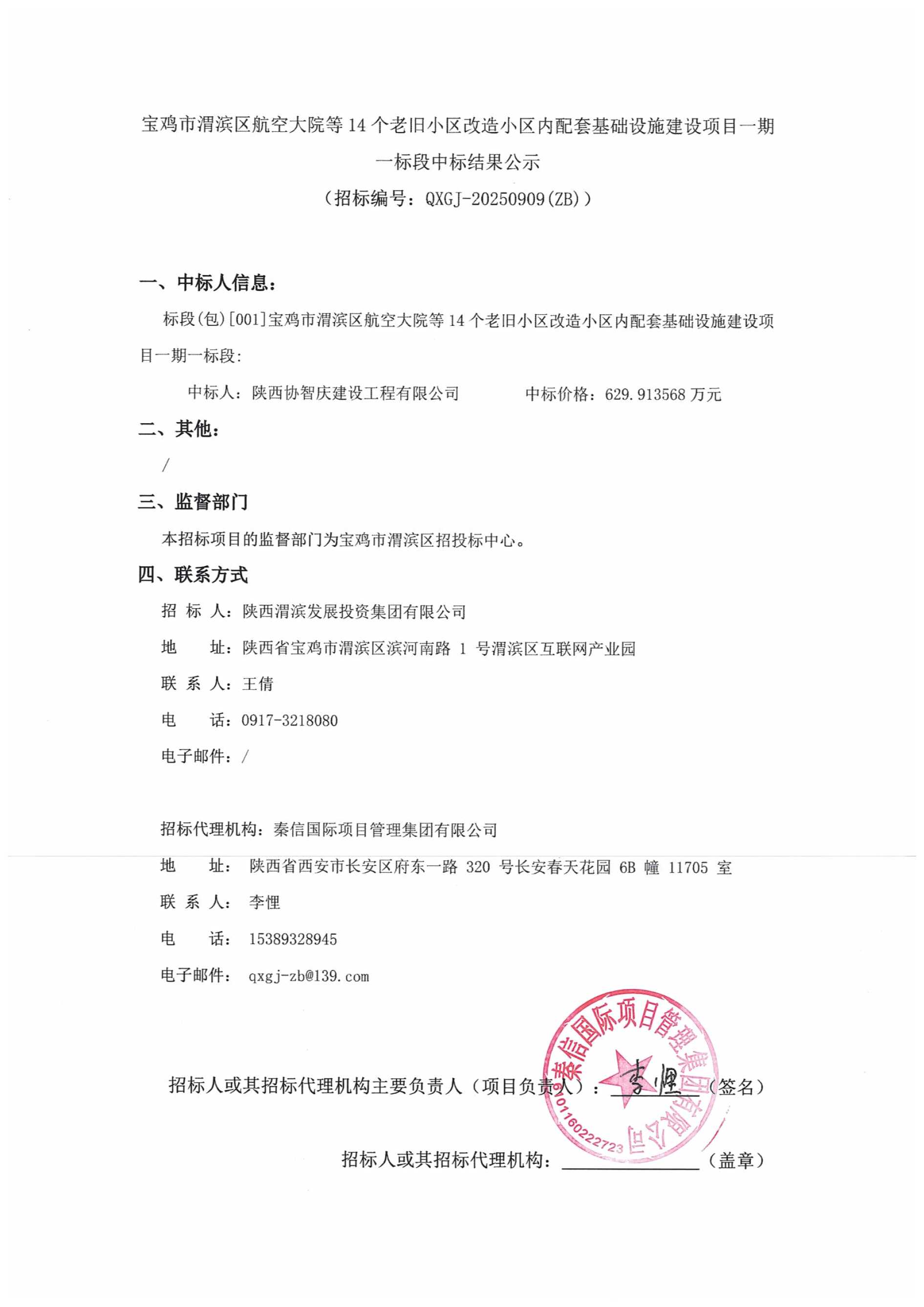 宝鸡市渭滨区航空大院等 14 个老旧小区改造小区内配套基础设施建设项目一期 一标段中标结果公示