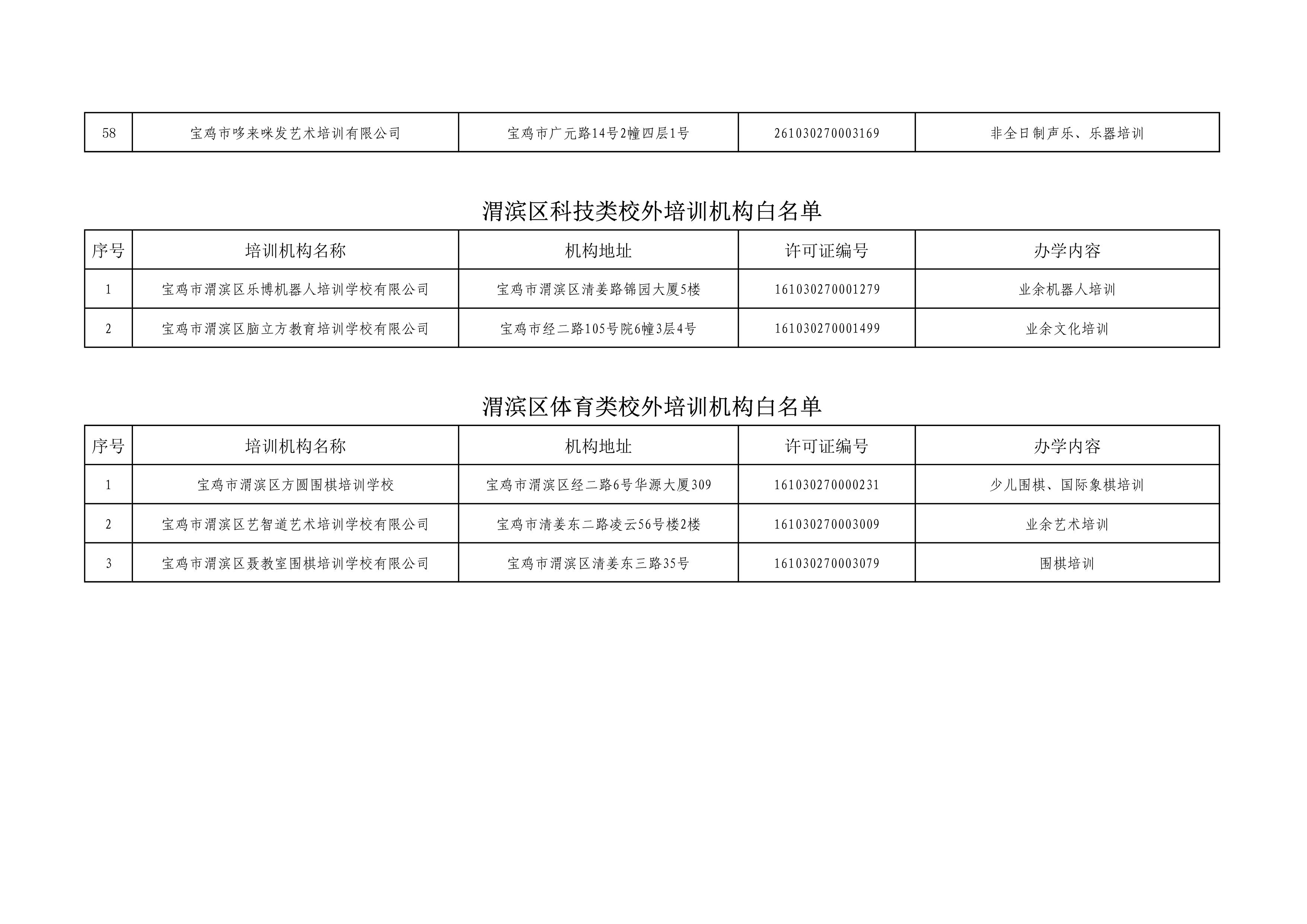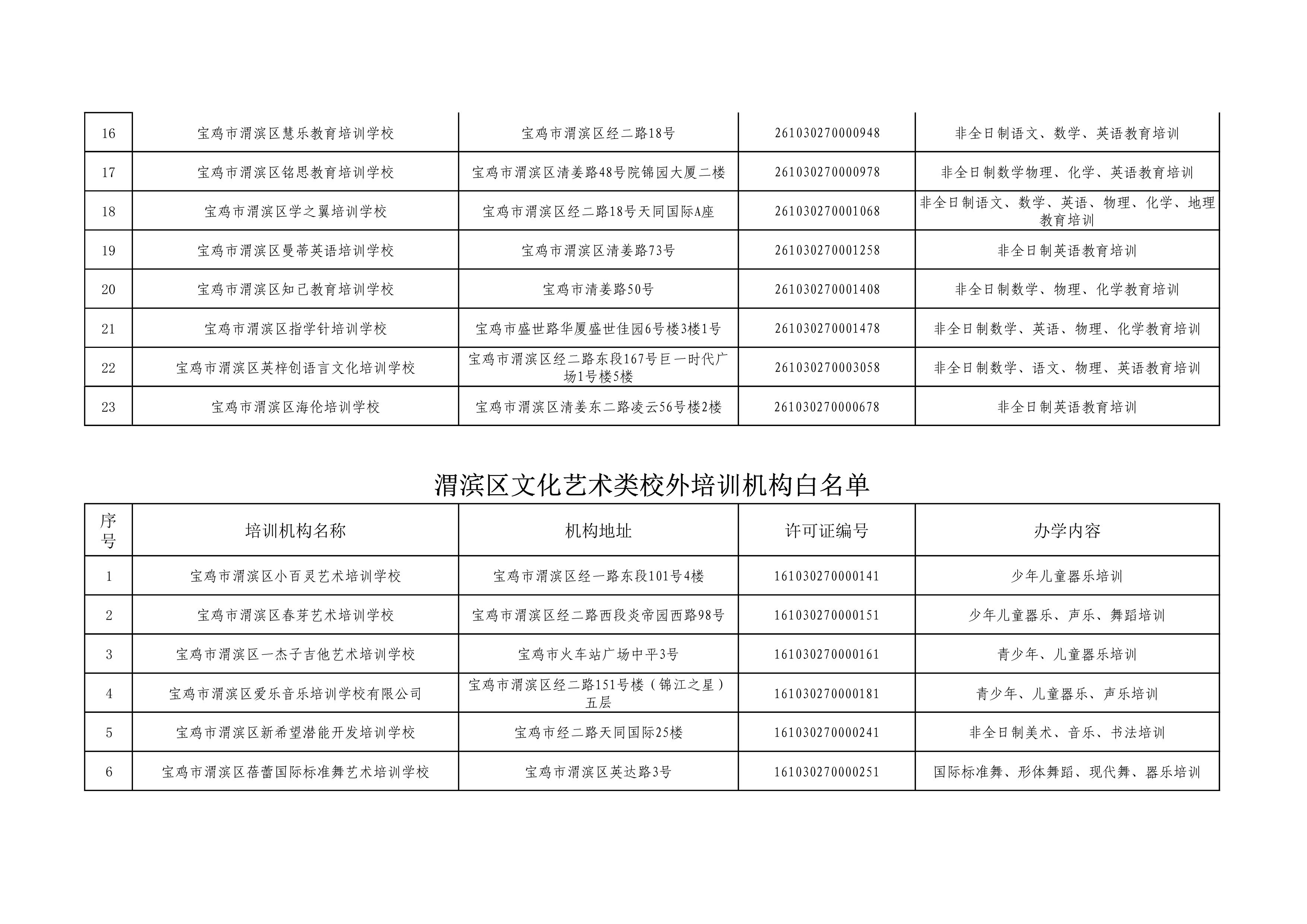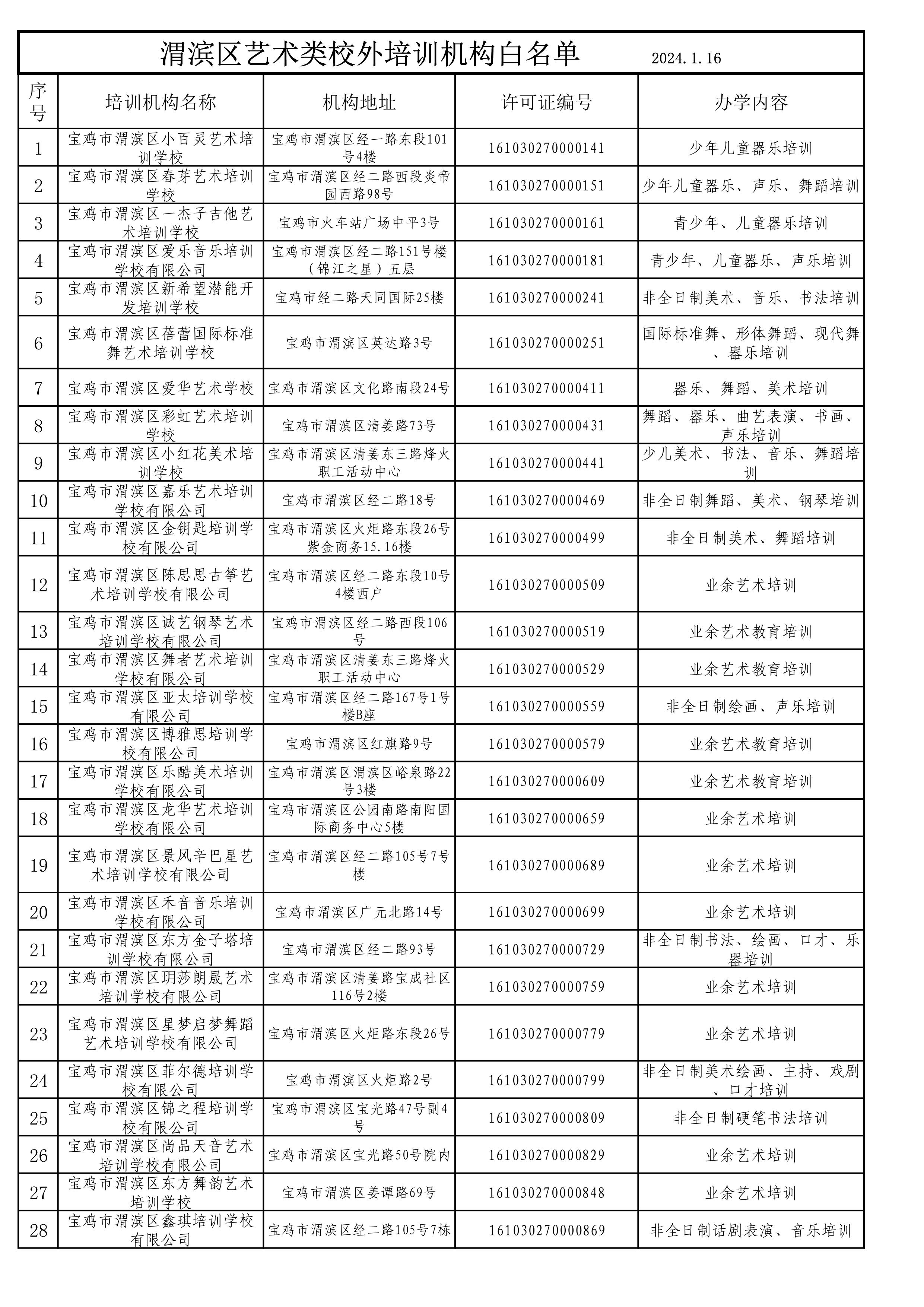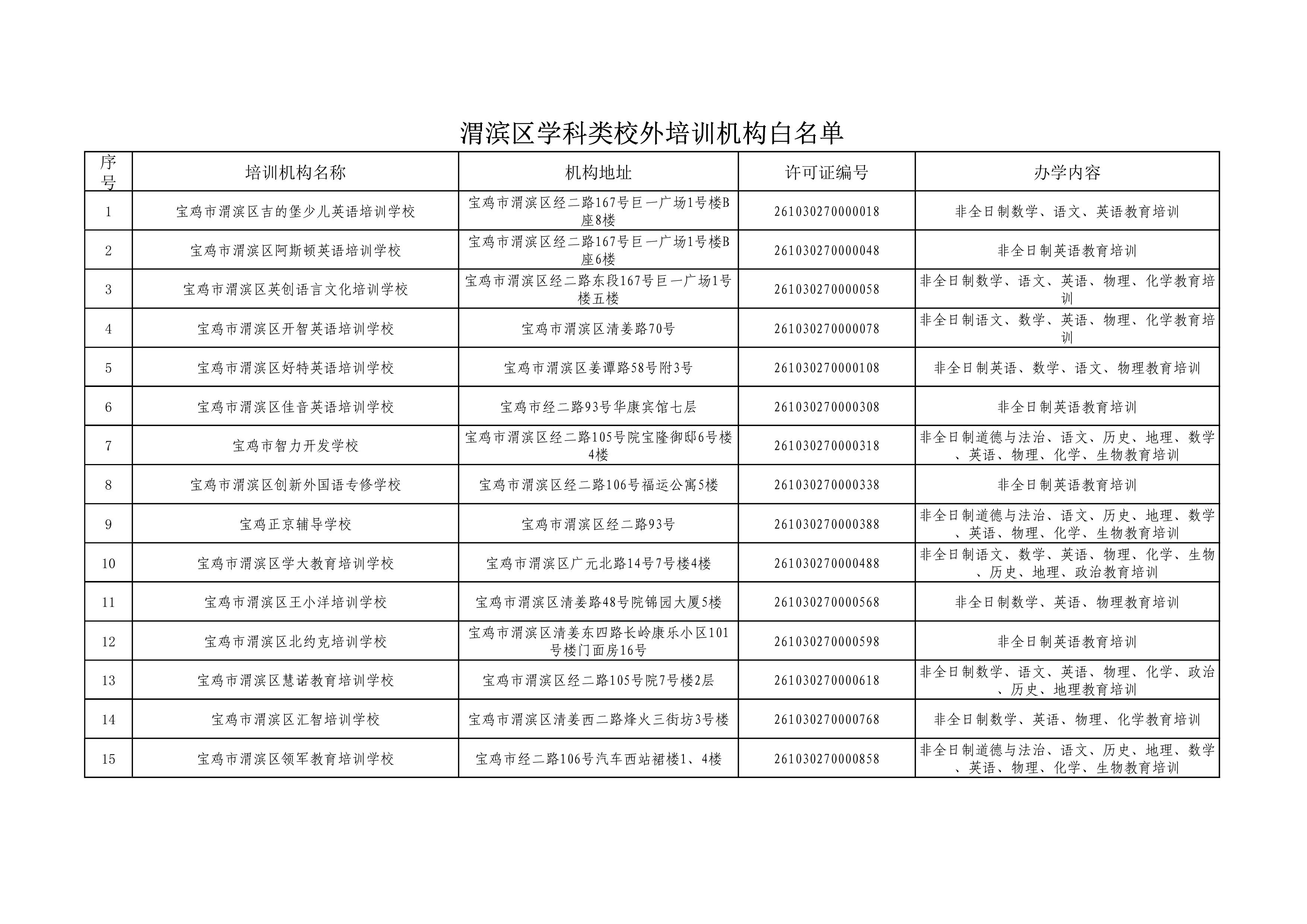 为贯彻落实国家“双减”政策,进一步强化对校外培训机构的监督管理,规范各类校外培训机构办学行为,切实维护广大学生家长合法权益,有效促进学生全面发展与健康成长,现将渭滨区2024年校外培训机构“白名单”予以公告,其中学科类23所,文化艺术类59所,科技类2所,体育类3所。