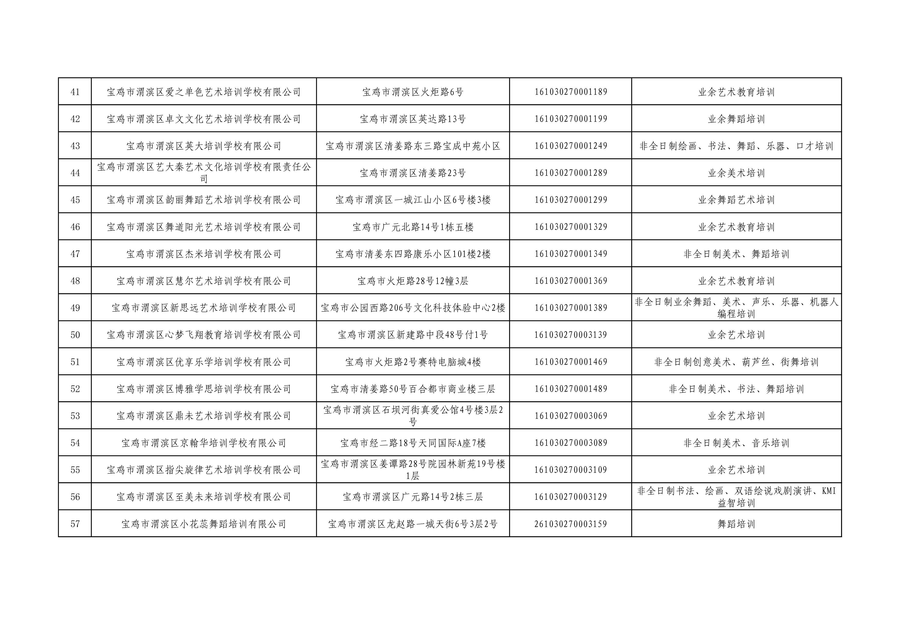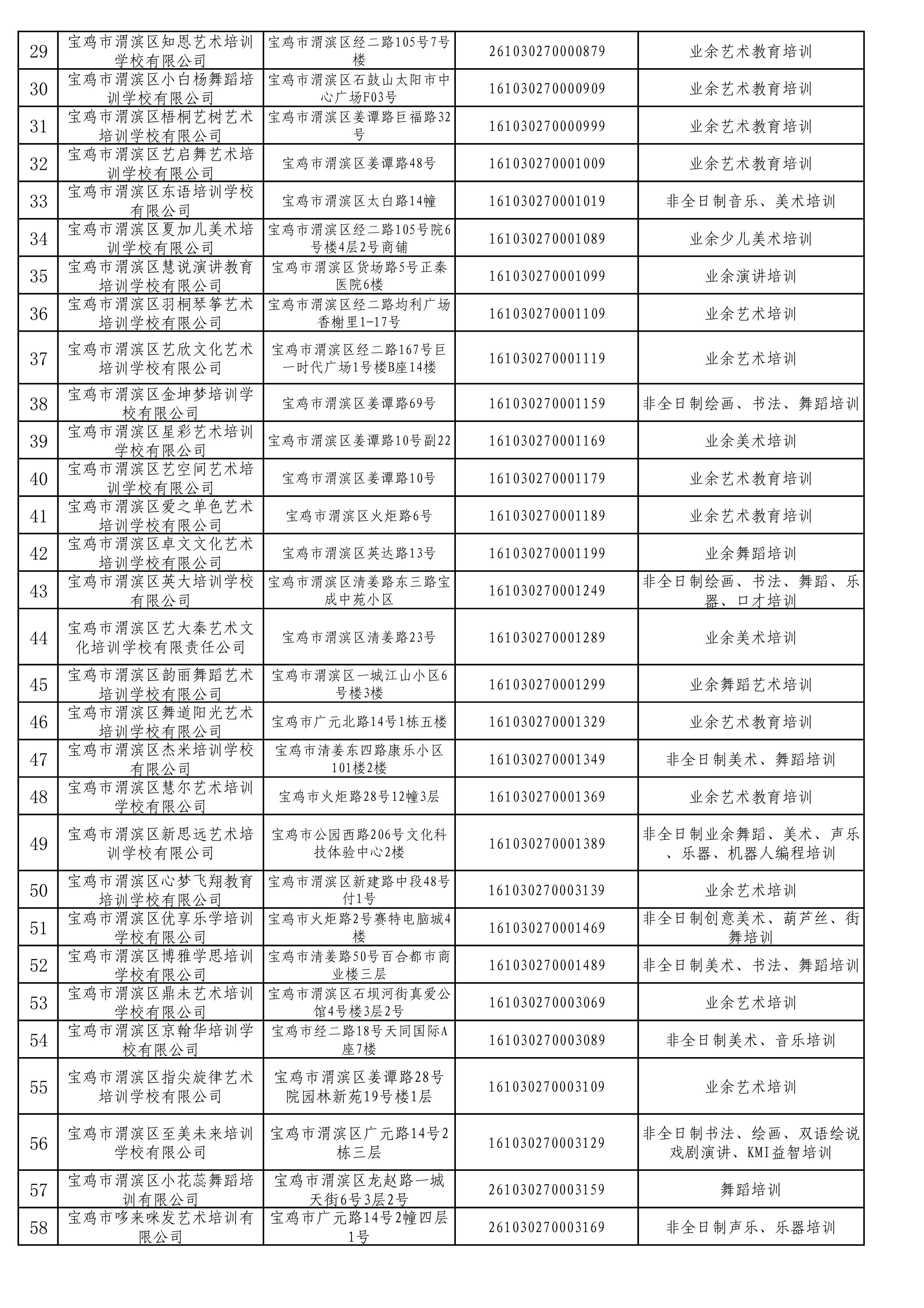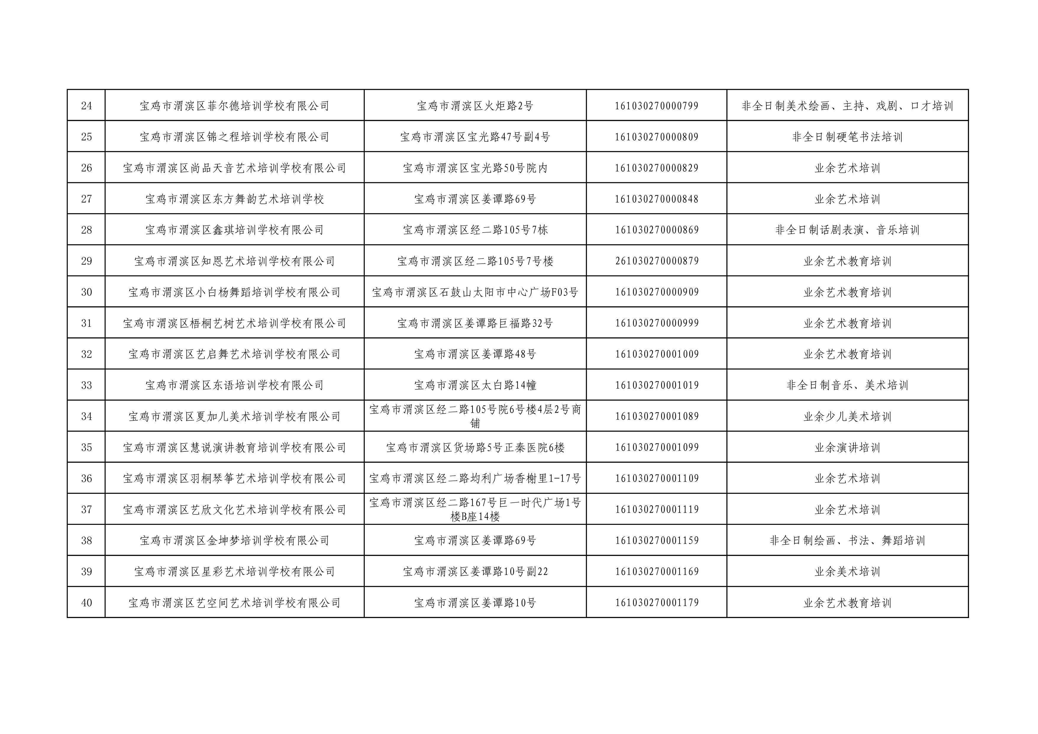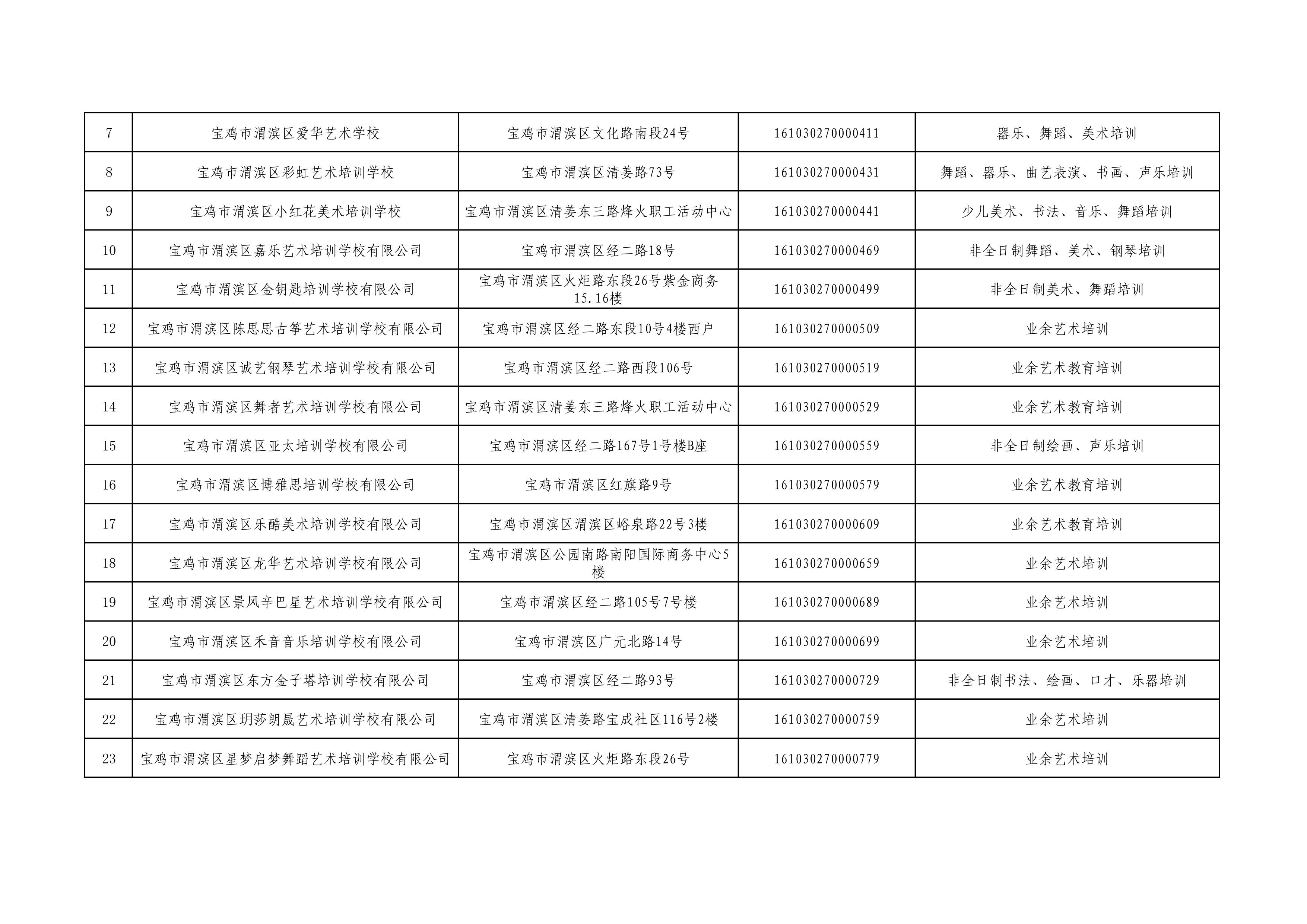 为贯彻落实国家“双减”政策,进一步强化对校外培训机构的监督管理,规范各类校外培训机构办学行为,切实维护广大学生家长合法权益,有效促进学生全面发展与健康成长,现将渭滨区2024年校外培训机构“白名单”予以公告,其中学科类23所,文化艺术类59所,科技类2所,体育类3所。