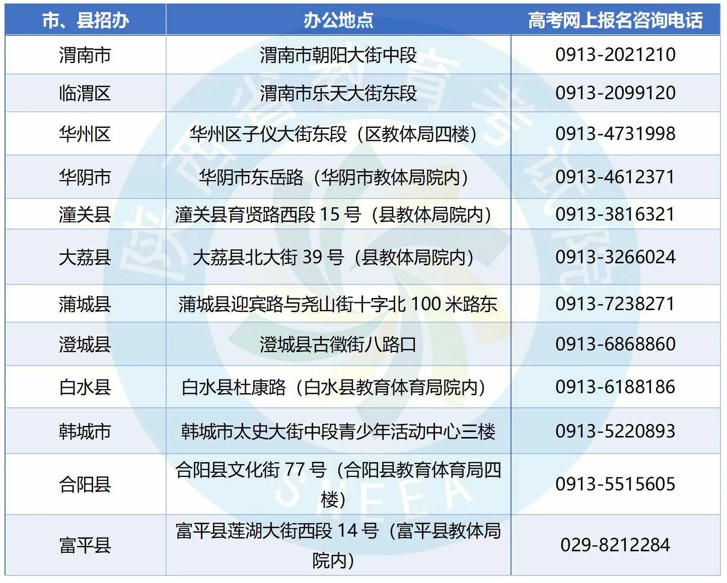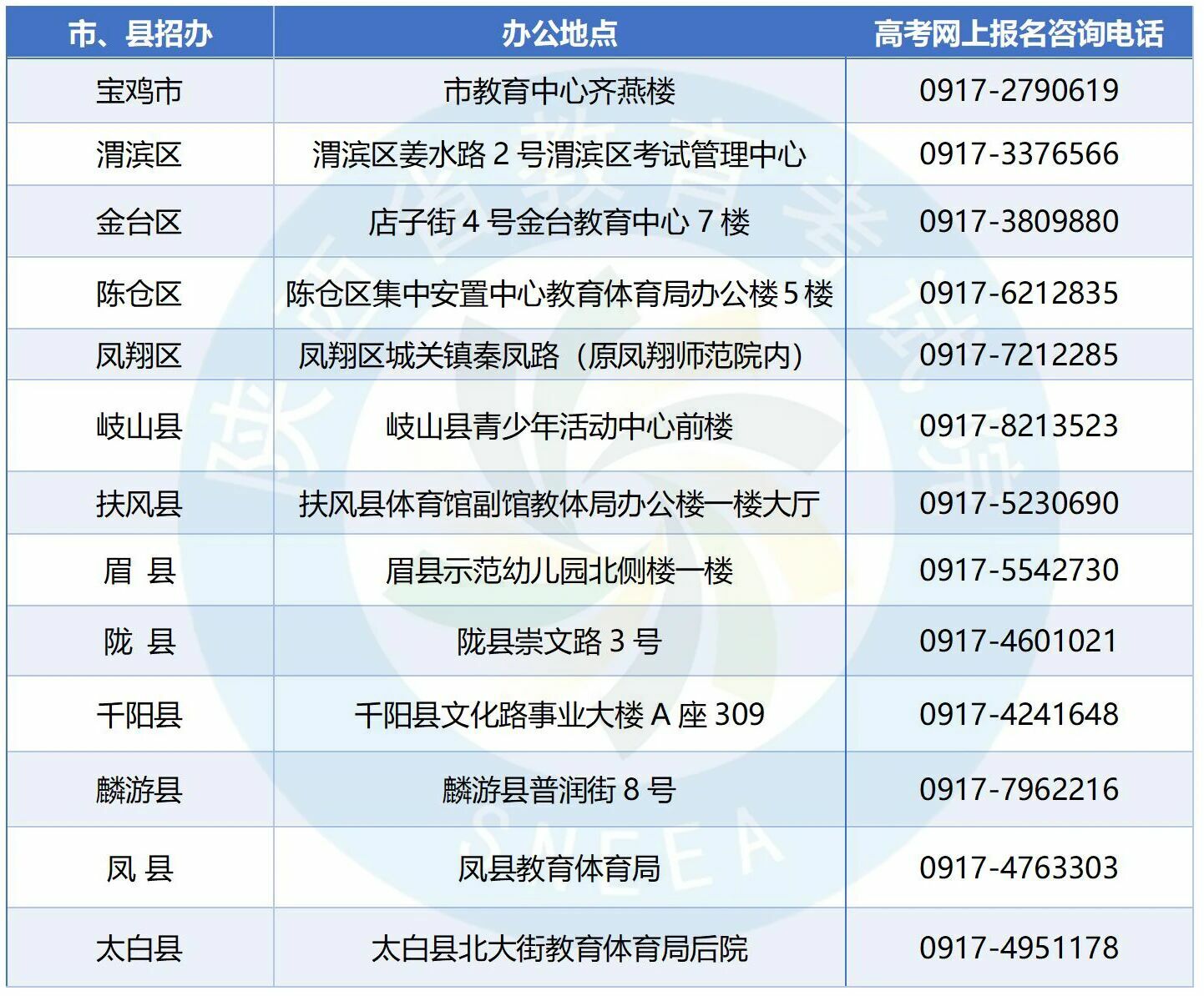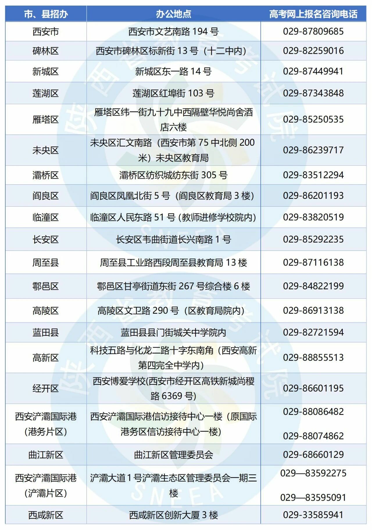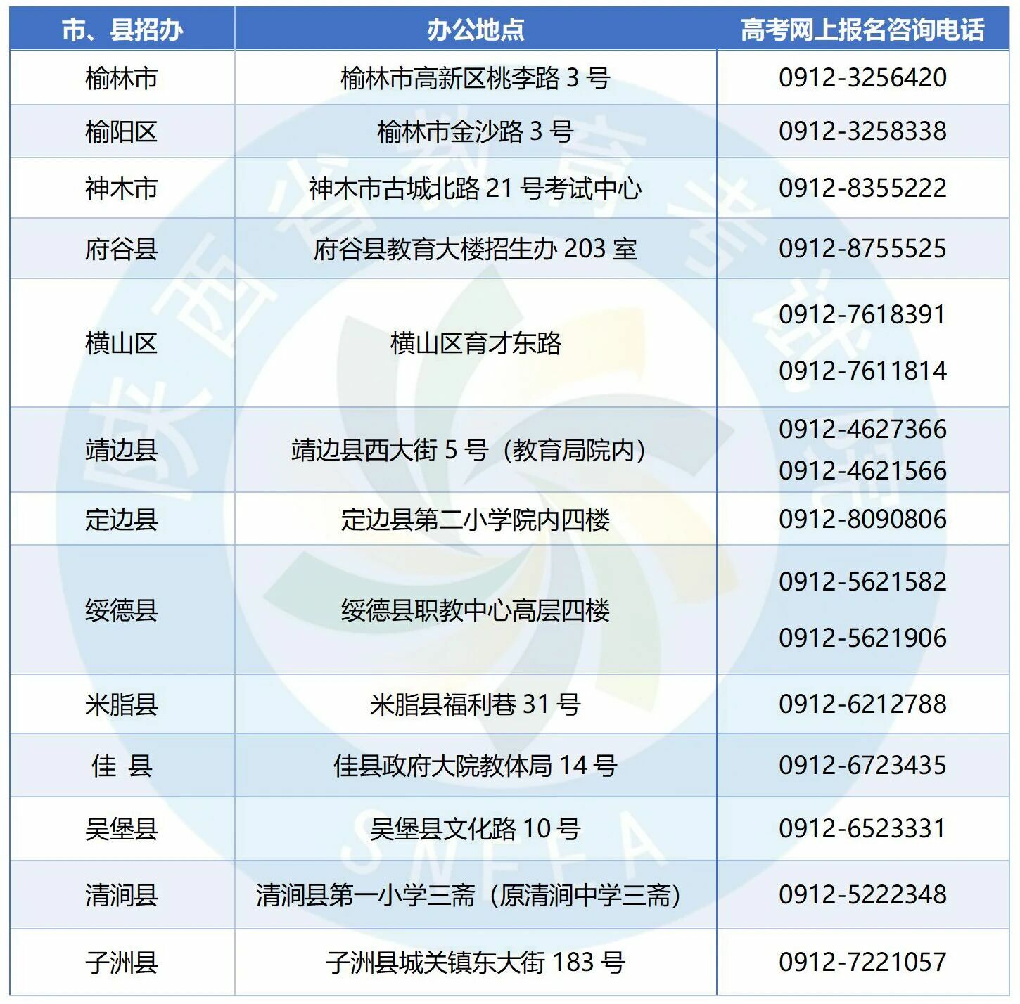 2026年陕西省高考网上报名将于2025年11月1日正式开始,报名过程中,考生如遇到政策类问题,请拨打以下各县(区)招办电话咨询。