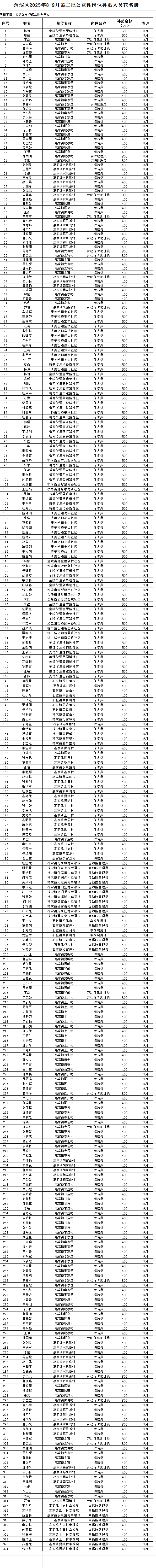 按照宝鸡市人社局、财政局关于印发《宝鸡市公益性岗位开发管理实施细则》的通知(宝人社发〔2023〕42号)、关于印发《宝鸡市就业补助资金管理实施细则》的通知(宝市财办社〔2021〕6号)文件要求,现将渭滨区2025年8-9月第二批公益性岗位补贴资金予以公示。如对公示内容有异议,请在公示期内向渭滨区劳动就业服务中心提出意见,如无异议,公示期满将按程序执行。