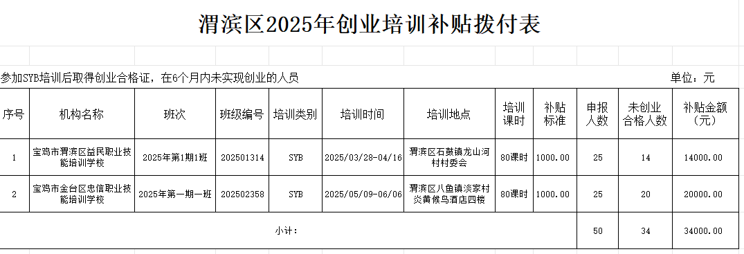 根据宝鸡市人力资源和社会保障局、宝鸡市财政局《关于进一步加强全市职业技能培训有关工作的通知》(宝人社函〔2025〕200号)文件精神,现将2025年度创业培训(2家培训学校)予以公示,如对公示内容有异议,请在公示期内向渭滨区劳动就业服务中心提出意见,如无异议,公示期满将按程序执行。