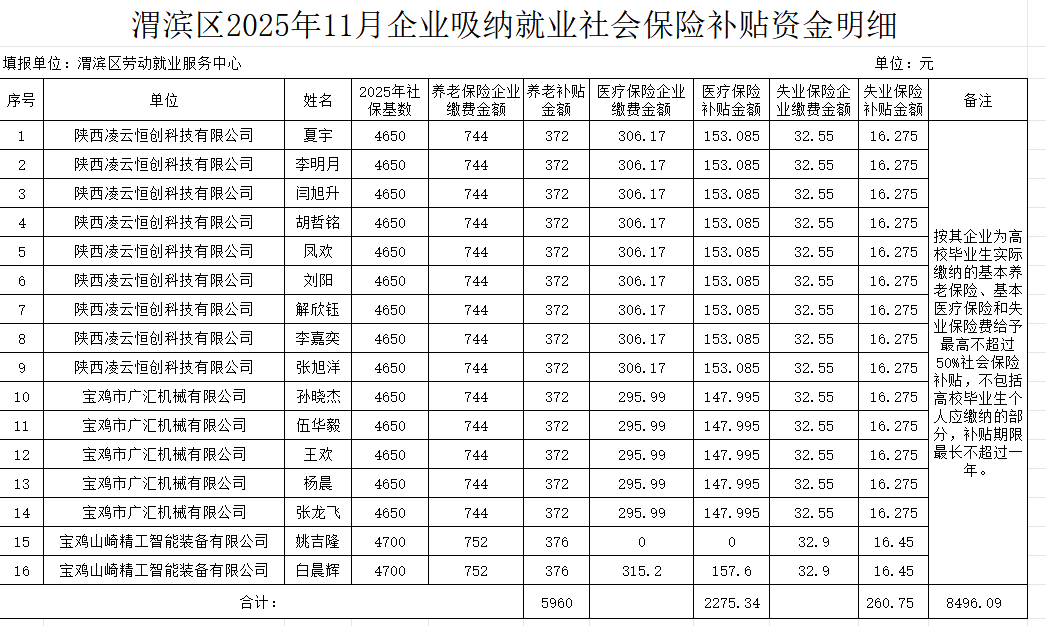 根据宝鸡市人力资源和社会保障局《单位吸纳就业社会保险补贴和企业一次性吸纳就业补贴“直补快办”工作方案》(宝人社函〔2022〕250号)和《渭滨区就业补助资金管理实施细则》(宝渭人社发〔2021〕21号)文件精神,我中心对陕西凌云恒创科技有限公司、宝鸡市广汇机械有限公司、宝鸡山崎精工智能装备有限公司职工夏宇等16人的企业吸纳高校毕业生社保补贴情况进行审核,现将审核结果予以公示,公示时间为2025年11月25日至2025年12月3日,公示期7个工作日。单位和个人如对公示内容存在异议,可通过来信、来电、来访等形式反映。单位反映问题的,须盖公章;个人反映问题的,提倡署本人真实姓名。