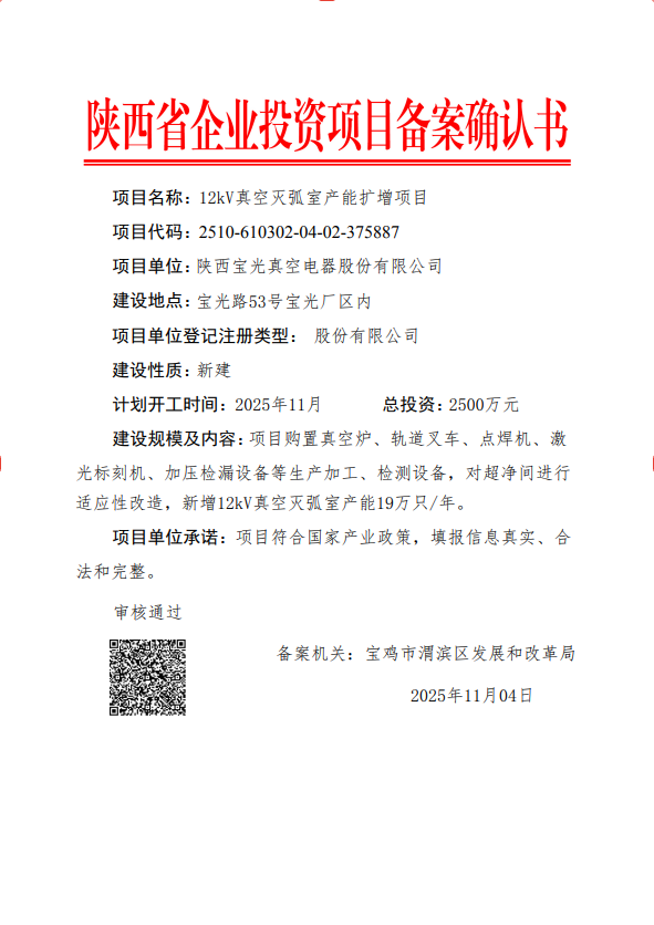 12kV真空灭弧室产能扩增项目