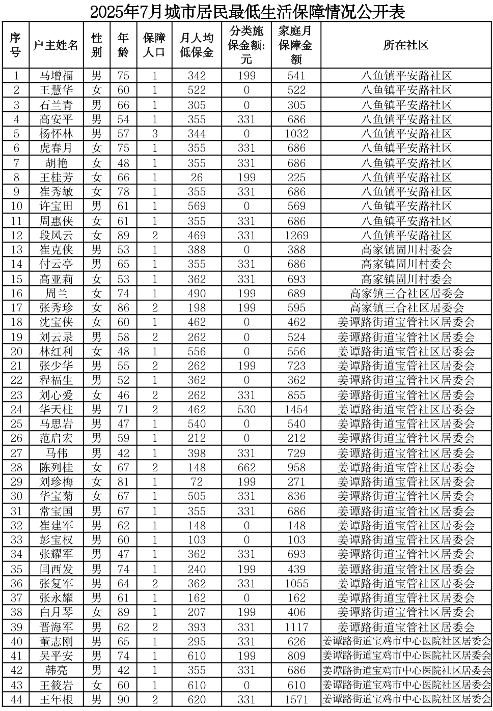 附件:渭滨区2025年7月城市居民最低生活保障情况公开表