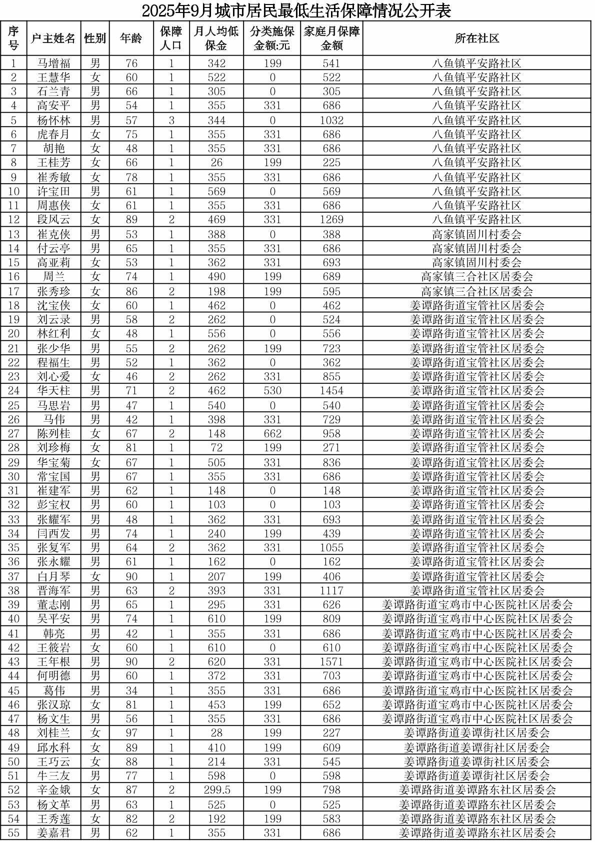 附件:渭滨区2025年9月城市居民最低生活保障情况公开表