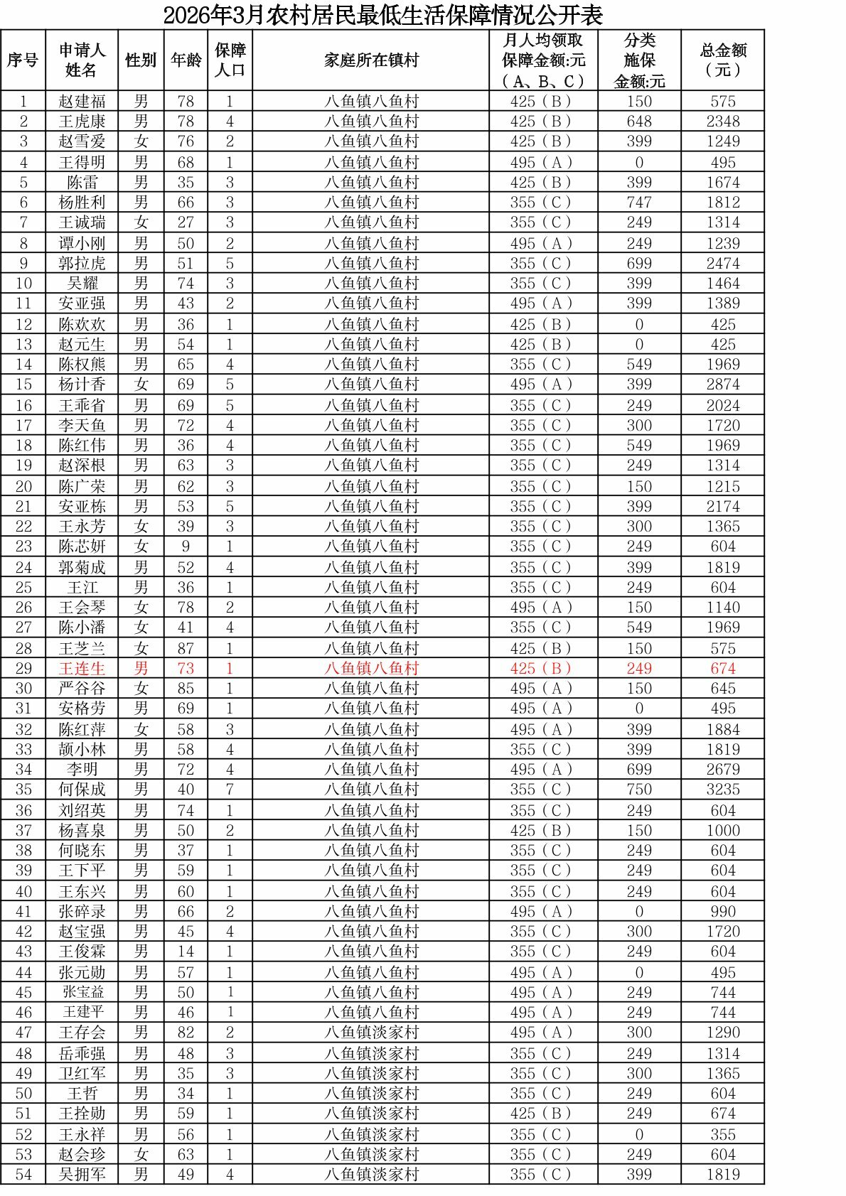 渭滨区2026年3月农村居民最低生活保障情况公开表