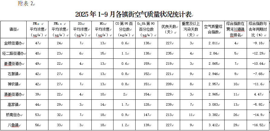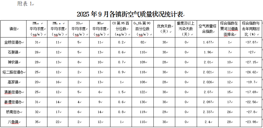 二、各镇街空气质量。9月,各镇街空气质量综合指数由好到差依次是金陵办、石鼓镇、神农镇、经二路办、高家镇、清姜办、姜谭路办、桥南办、八鱼镇。