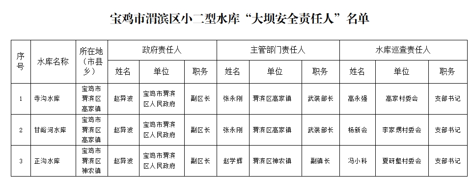 按照宝鸡市水利局《关于落实2024年水库大坝安全责任人的通知》要求,现将渭滨区3座小二型水库“大坝安全责任人”名单公示如下: