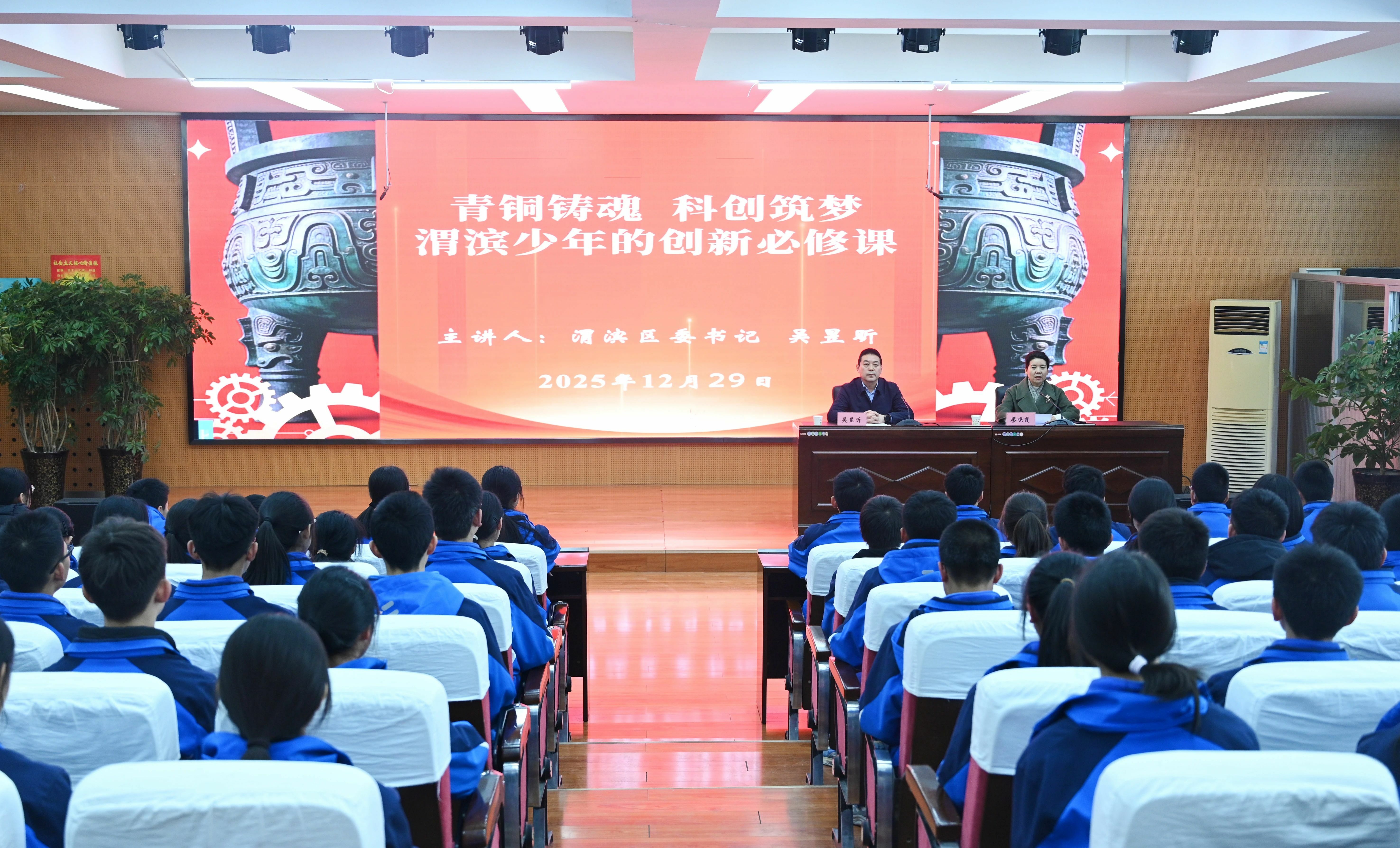 12月29日下午,渭滨区委书记吴昱昕走进新建路中学讲授思政课,勉励全区广大学子砥砺创新精神,勤于发现、精于思考、勇于实践,为推进现代化建设和高质量发展贡献力量。
